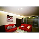 既存の玄関ホールをリビングに取り込み広いリビングに・・・。リビングの土佐漆喰の壁はライティングプランによる「あかり」で陰影を映し出し、癒しの空間を演出。