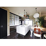 ダーク系の床にフロートタイプの白いキッチンが鮮烈な印象を与えるキッチン