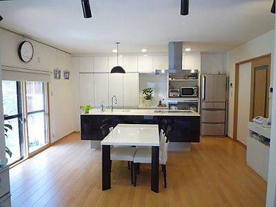 フロートアイランドにすることで料理教室もより一層楽しめます。収納がたくさんでき、さりげなく小物を飾れるカップボード。両サイドからの照明と白をメインにした内装で、明るく清潔感のあるキッチン&ダイニングにしました。