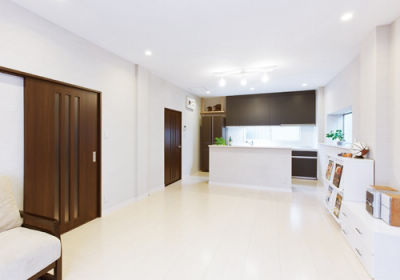 明るい色の床と濃いダークカラーの建具の組み合わせで軽やかな印象に