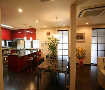モノトーンのシックなお部屋にモダンな赤いキッチンがとても映えてステキなLDKが完成しました。