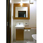 ミラーをスライドすると外光も入ってきます。壁面は吸湿性のある素材を使用、清潔感の高い色合いも素敵です。全自動おそうじトイレ「アラウーノ」はアームレスト付きタイプ