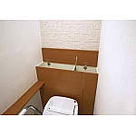 便座の背面空間も「キュット」を使用して有効活用、掃除用具やトイレットペーパーが収納できます