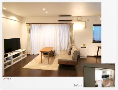 日当たりのいいお部屋なので、昼間は明るいですが、夜は間接照明を使用してムーディーな雰囲気を演出できるようにしました