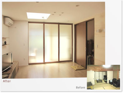 縁側とリビングの境には採光が十分に取れる大きな建具を採用しました。おかげで昼間はとても明るく、電気を点けなくても過ごせます。