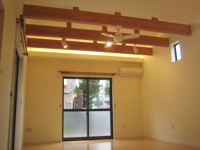 やわらかい間接照明を設置し、梁を出すことにより木の良さを活かしたおしゃれな空間にしました。