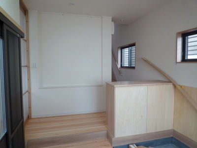 正面の壁には、奥様の趣味のパッチワークの作品を飾れるように、ニッチを設けピクテャーレールを取付けてあります。