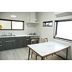 スモークオークのキッチンにホワイトオークのフローリングを合わせ「和モダン」なキッチンに!