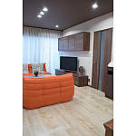 床材はアーキスペックの桧柄を採用し、壁・天井のクロスの貼り替えで部屋全体が明るくなった。黒い天井のクロスが、ダウンライトを引き立たせる。