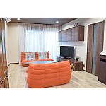 ローボードとテレビ、ソファーの配置を変更。ローボードはドア色と揃えてキュビオスを新調。不要な物は全てしまいこみ、掃除が楽に。