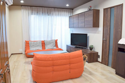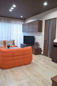 ローボードとテレビ、ソファーの配置を変更。ローボードはドア色と揃えてキュビオスを新調。不要な物は全てしまいこみ、掃除が楽に。