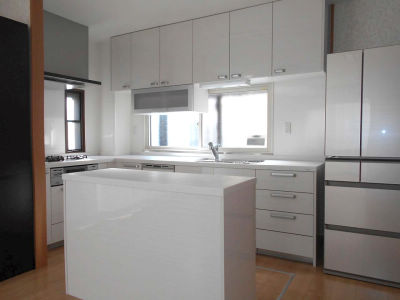 食器棚を撤去し、キッチンと同じLクラスのカウンタータイプのカップボードを採用。収納力もありアイランドとして使用でき、高さによる圧迫感もなくなったため、キッチン全体が明るくなった。