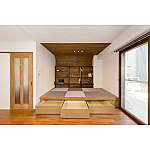 寝っ転がったり、洗濯物をたたんだり、子どもと遊んだりできる畳の小上がり。足を下ろしてパソコンや読書もでき、大活躍のコーナーです。畳下にも大容量の収納を確保。