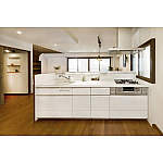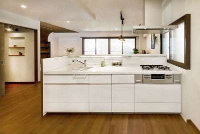 リビングが見渡せる対面式キッチン。背面には大きなパントリーを設けているので、キッチンはいつもきれいなまま。