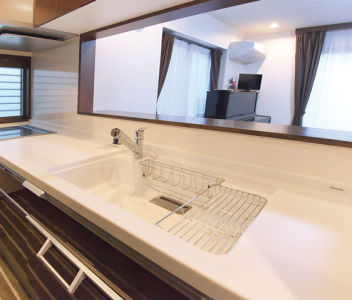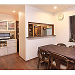 既存の窓カウンターをいかして明るい対面式キッチンに改造。家族の様子を見ながら調理ができるようになりました。