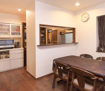 既存の窓カウンターをいかして明るい対面式キッチンに改造。家族の様子を見ながら調理ができるようになりました。