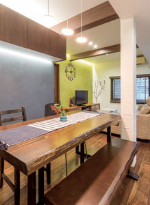 家族みんなで楽しく塗ったライムグリーンの壁。とても気に入っていて、思い出深いものになりました。ライン照明が、塗り壁の色を際立たせています。