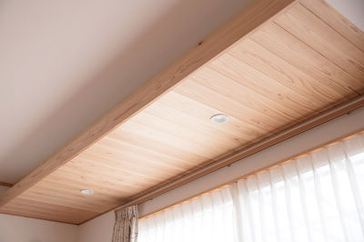 明るい日差しが差し込むダイニングエリアのコーナー出窓。窓の両脇には天井と同じ杉板のアクセントウォールが設けられ、自然にすっぽりと包まれているような気分に。