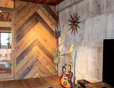 ご主人が惚れ込んだTV番組のセットの雰囲気を再現するべく、リビングの壁をヘリンボーンに仕上げ、インテリアの見せ場にしました。インドアグリーンやコンクリート調の壁紙とも相性が抜群。