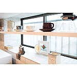 飾り棚は手前に、宙に浮いたように設置し、自然光が小物を照らす演出も計算。