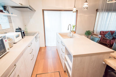 収納・回遊動線を考慮してレイアウトしたⅡ型アイランドのキッチン。シンク横にご主人が珈琲を淹れる広いスペースを。
