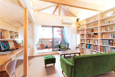 リビングにある夫婦の作業スペース。それぞれが好きなものをディスプレイ。