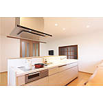 カップボードと間を広げ設置したアイランド型キッチン。回遊でき動きやすくなりました