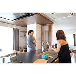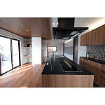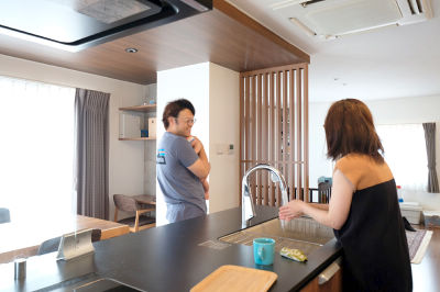 キッチンまわりに自然と家族が集まる アイランドキッチンは回遊式で飲み物を取りに行くときでもお互いぶつからずストレスのない動線