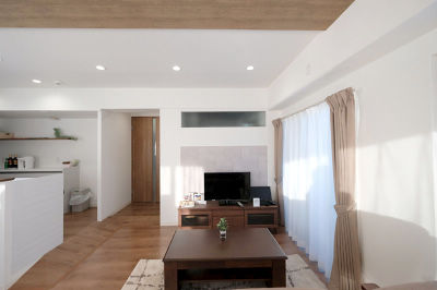 和室の天井だったところを木目調の天井に 和室をなくしたので約20帖のLDKに変わりました