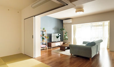 洋室を取り除くことで、日が降り注ぐ明るく開放的なリビングを創出。和室の引き戸を開放すればリビングと一体化し、LDKがさらに大空間に。