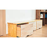 ダイニングにある備え付けのベンチは、たっぷり収納できる引き出し式の収納。