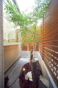 奥様はナチュラルテイストが好みなので、坪庭にはシマトネリコの木を植えて、和風過ぎない軽やかなイメージに。