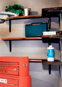 工具などを置いておくための、ギャラリースペースの棚。足場板を使ってワイルドな仕上げになっています。