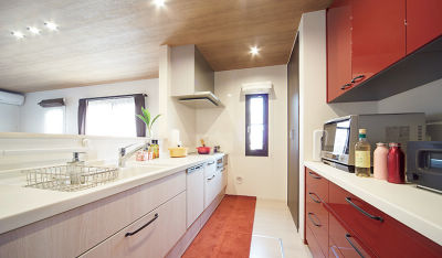 LDKは木目の天井やレンガの壁紙でスタイリッシュな空間に。