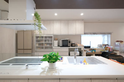 ぐるぐる回れるアイランドキッチン回遊できるキッチンは家族で込み合うこともないです