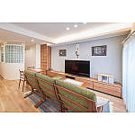 システムファニチャーで物が見えない収納を実現し、すっきり片付いたLDK。LDKとホビールームを緩やかに仕切る壁は、光が漏れるガラスブロック。