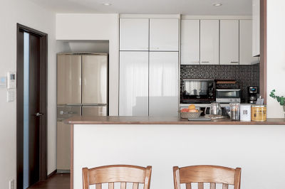 冷蔵庫を、隣に並ぶカップボードとつながって見えるように壁の中におさめました。