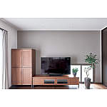 全体に白い色の空間に茶色やグレーベージュを使い、アクセントをつくりました。テレビ背面の壁を奥様の好きなグレーベージュに。お使いの家具ともマッチしています。
