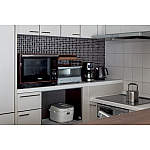 ダイニングから見える家電コーナーには、背面に濃い茶色のタイルをあしらいました。