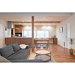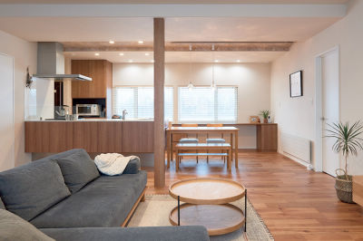 2部屋の洋室を広々としたLDKにリフォーム。眺めの良い既存の窓も生かし、開放感たっぷりに。構造上、取れなかった柱を内装と同柄のラッピング化粧ボードでコーディネイト。空間のアクセントに。