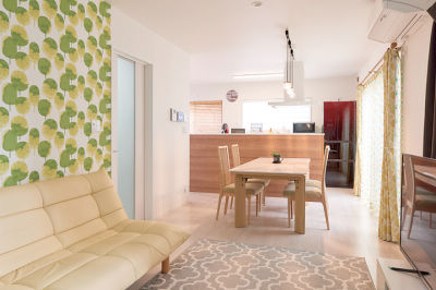 グリーンの壁紙が印象的なリビング。奥は間仕切りを開けるとつながる家事室。家事室とリビングの間に半透明の間仕切りを設置。閉めても、明るく圧迫感がありません。