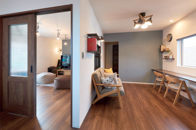 リーディングルームと洋室をつなぐ室内窓。風も光も通し、快適性を高めます。隣室にいる人の気配をお互いが感じられます。