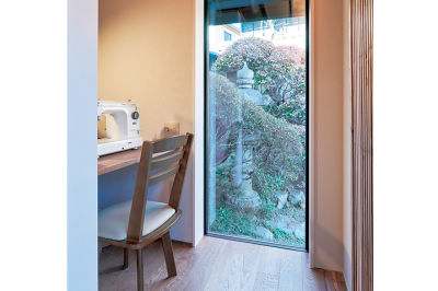 ご両親が使っていた昔の本棚のガラスを、パントリーの上の開口に使用。細部まで思い出あふれる住まいに。