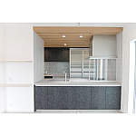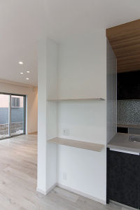 撤去不可な耐力壁を活かした収納スペース。収納裏には冷蔵庫置き場を設け、生活感の出過ぎないLDKを目指します。