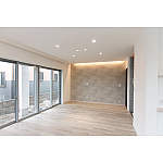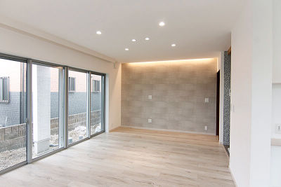 家族が集まるリビングには、落ち着いた色のアクセントクロスに間接照明をチョイス。大開口の掃出し窓が、リビングをより広く見せます。