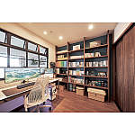 キッチン裏に奥様憧れの書棚を設置。読書スペースを隣接させました。