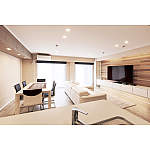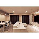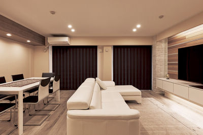 空間をやさしく包み込む間接光。レッドシダーの壁やTV台下の床をやさしく照らし、素材の美しさを引き出してくれます。シーンに合わせて明るさを変え、ホテルライクを満喫。