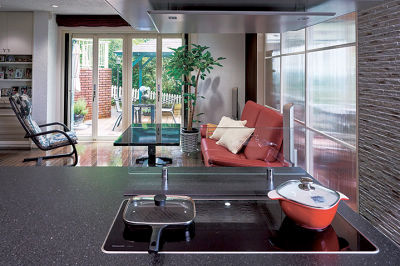 リビングとキッチンが一体化。大きな開口からは緑が見え、気持ちよく料理ができます。