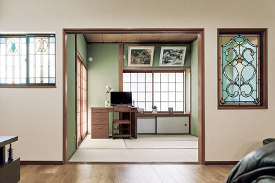 和室仕上げの壁はうぐいす色に仕上げ落ち着いた空間に。新築時から大切にされているステンドグラスが引き立ちます。