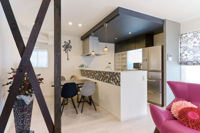 構造上残した筋交いとキッチンの下がり天井は色を合わせて、LDKのアクセントに。